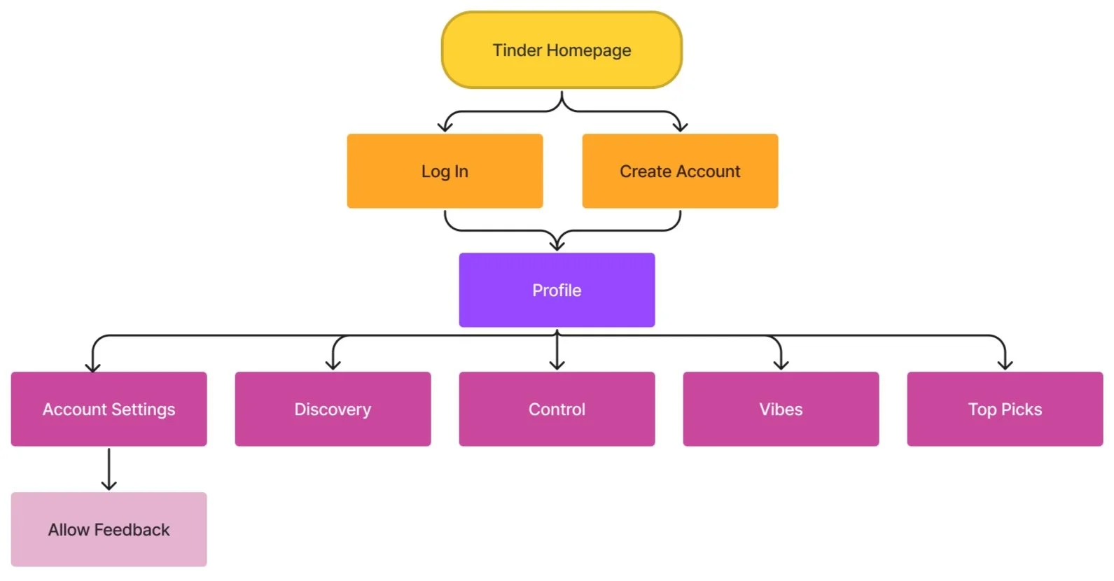 The site map shows the structure of the Tinder onboarding process and reaching the settings where the user can switch the Feedback section on or off.